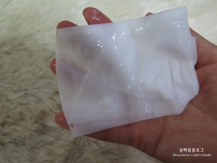 팩을 뜯어보니 흐르는 투명한 수분감이 느껴지는 것이 아니라 하얀색의 크림제형이 보입니다 하얀색의 크림이 듬뿍 적혀져 있는 마스크 팩이에요 에센스 제형으로 넉넉하게 팩이 적셔져 있답니다 뚝뚝 흐르거나 흘러내지지 않았어요